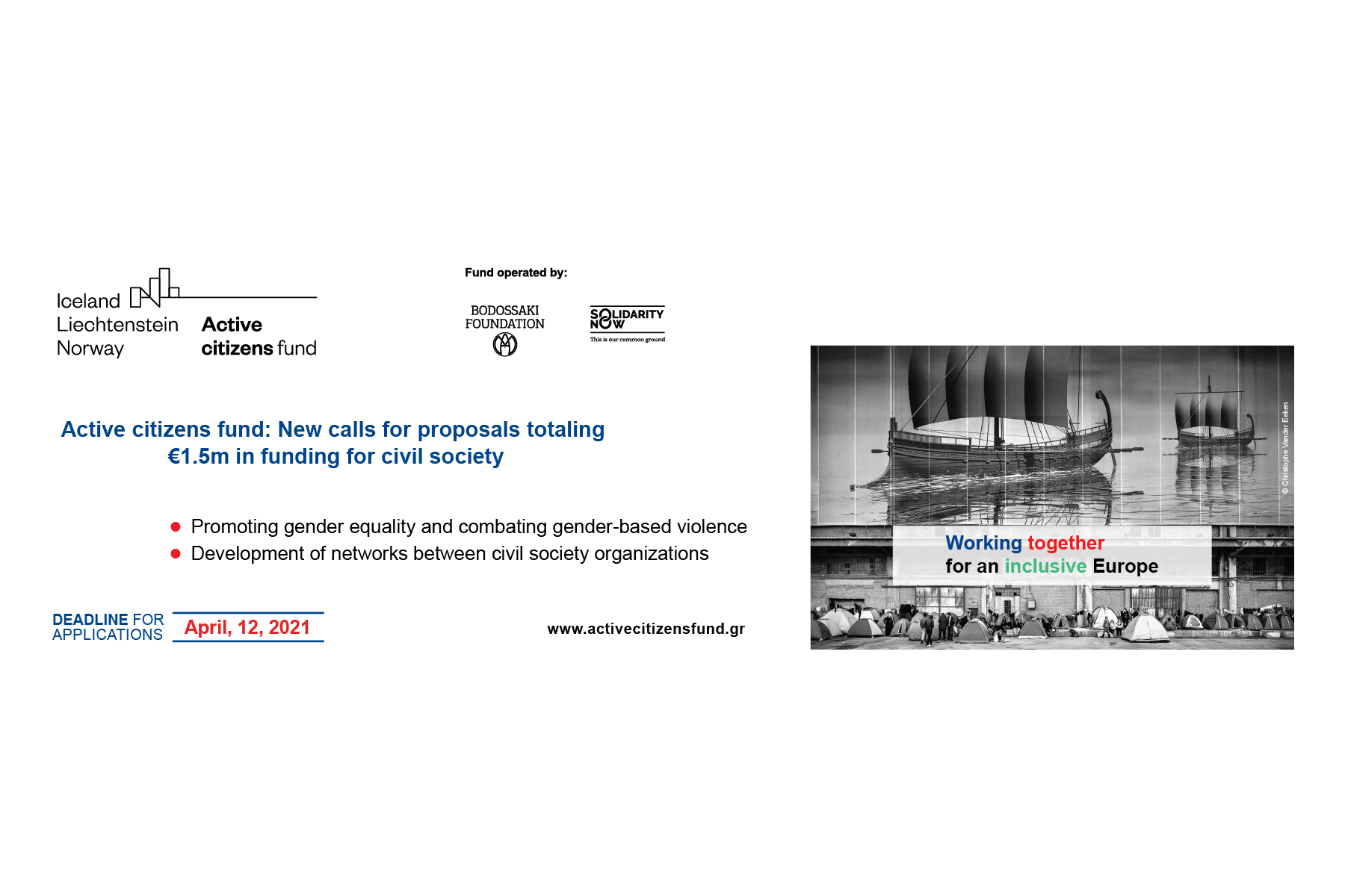 The Bodossaki Foundation and SolidarityNow, in their capacity as the Fund Operator of the Active Citizens Fund programme in Greece, which has already allocated over € 7 million to support Civil Society, announces two open calls for proposals: “Gender equality promoted and gender-based violence combatted” and “Platforms and networks among CSOs developed”.