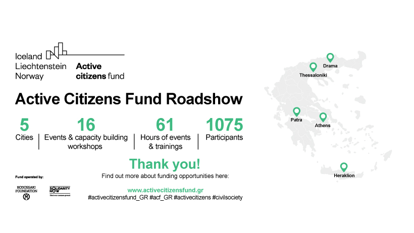 With the participation of 1075 representatives of civil society organizations, representatives of local authorities and local entities, the ‘roadshow’ for the presentation of the Active Citizens Fund in Greece has now been completed. The roadshow began with the programme launch event in Athens on 21 February 2019 and finished off in Heraklion, Crete, on 21 March 2019. Events were also held in Thessaloniki, Drama and Patra.