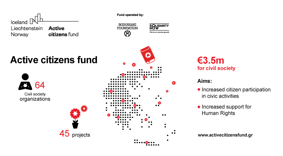 The Active Citizens Fund in Greece is supported through a € 12m grant from Iceland, Liechtenstein and Norway as part of the EEA Grants 2014 – 2021. The programme aims to develop the sustainability and capacity of the civil society sector in Greece, and to strengthen its role in promoting and safeguarding democratic procedures, active citizenship and human rights.