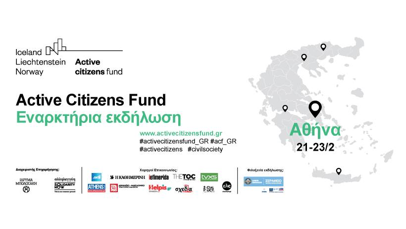 Η εναρκτήρια εκδήλωση του προγράμματος Active Citizens Fund στην Ελλάδα θα πραγματοποιηθεί την Πέμπτη 21 Φεβρουαρίου στις 4 το απόγευμα στο Σεράφειο του δήμου Αθηναίων. Η συμμετοχή είναι δωρεάν, απαιτείται όμως προεγγραφή, στον ακόλουθο σύνδεσμο