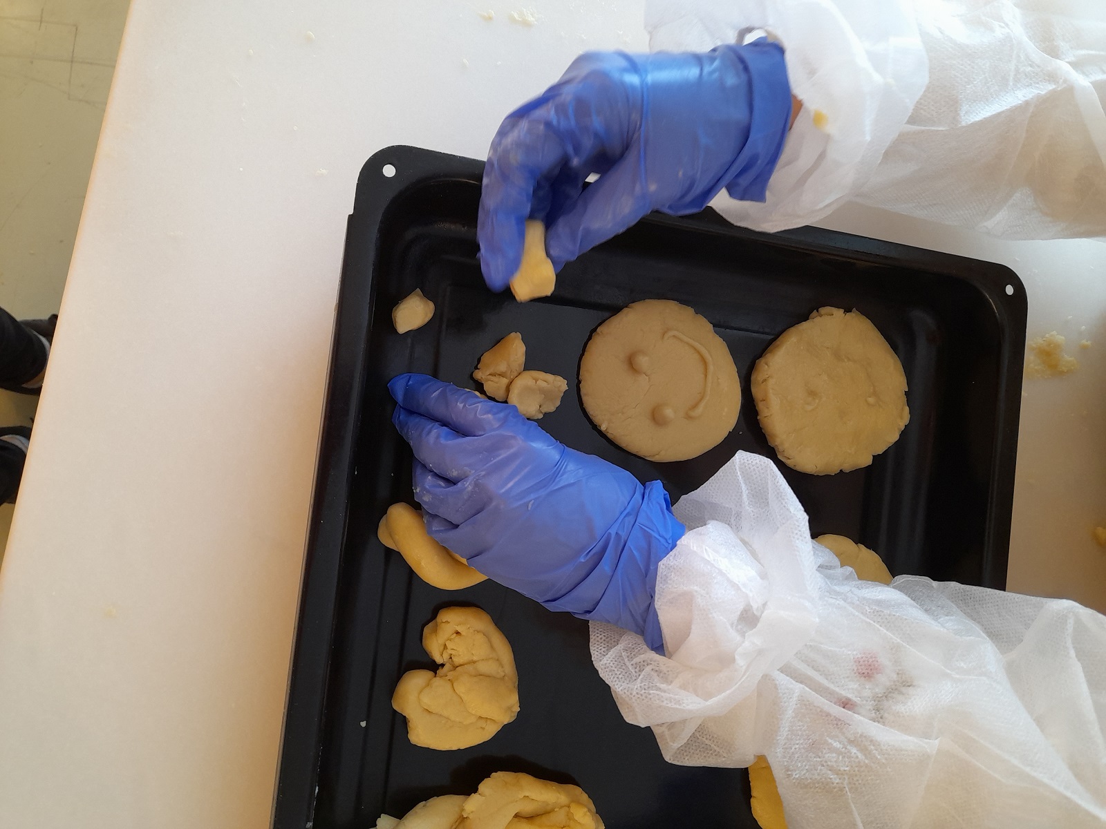 Τέλος στην Κουζίνα, με τα υπέροχα εργαλεία, απαραίτητο εξοπλισμό και ρούχα τα παιδιά φτιάξανε γεμάτα περηφάνεια τα δικά τους μπισκότα. Αξιοσημείωτο είναι ότι ενώ δεν ήταν όλα γνωστά στα ελληνικά, ακολουθώντας το ένστικτό τους προχωρούσαν στις σωστές οδηγίες, συνδυάζοντάς τες με νέες λέξεις και φράσεις… Ο ενθουσιασμός τους ήταν τόσο μεγάλος που παρά το γεγονός ότι ζωγραφίσαμε τα υλικά, τα ίδια επέμειναν να τα γράψουμε στα ελληνικά για να τα δείξουν στους γονείς τους!