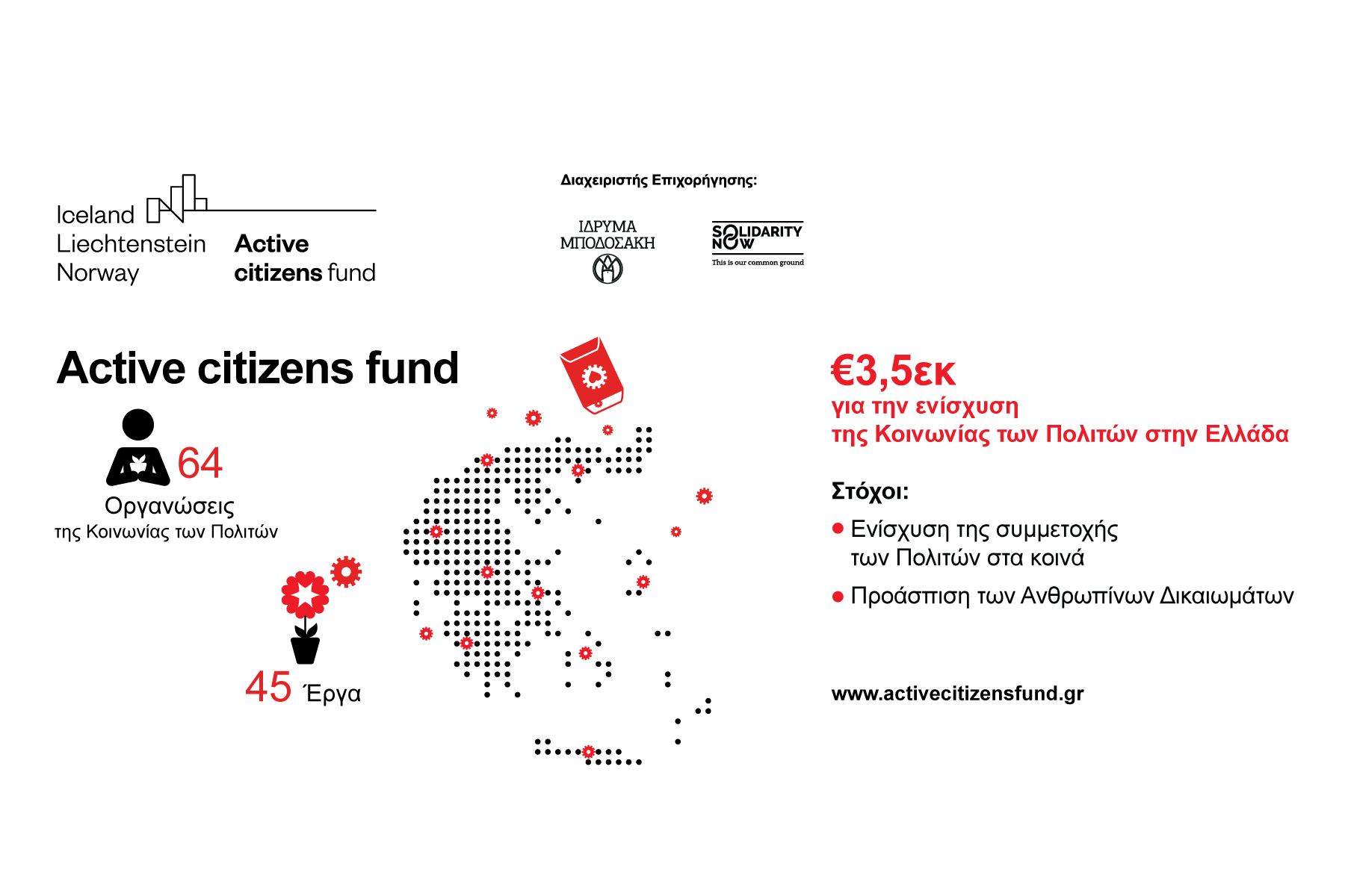 Το πρόγραμμα Active citizens fund, ύψους € 12εκ, χρηματοδοτείται από την Ισλανδία, το Λιχτενστάιν και τη Νορβηγία και είναι μέρος του χρηματοδοτικού μηχανισμού του Ευρωπαϊκού Οικονομικού Χώρου (ΕΟΧ) περιόδου 2014 – 2021. Το πρόγραμμα στοχεύει στην ενδυνάμωση και την ενίσχυση της βιωσιμότητας της Κοινωνίας των Πολιτών και στην ανάδειξη του ρόλου της στην προαγωγή των δημοκρατικών διαδικασιών, στην ενίσχυση της συμμετοχής των πολιτών στα κοινά και στην προάσπιση των ανθρωπίνων δικαιωμάτων.